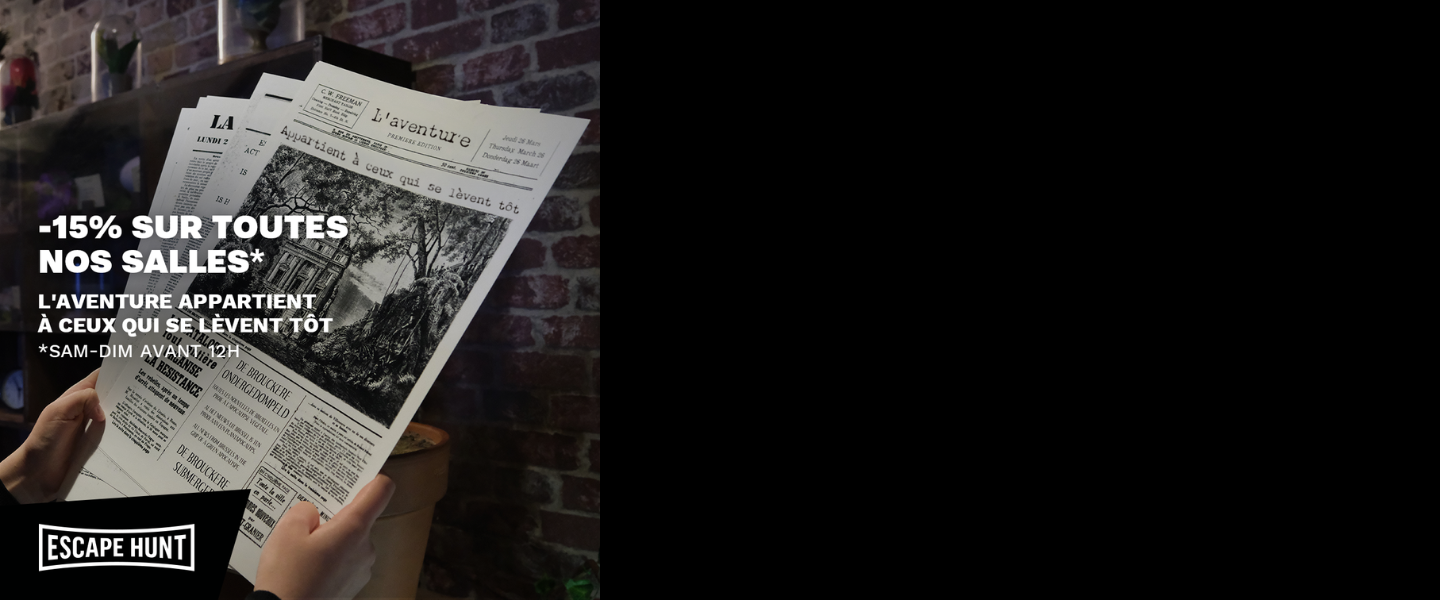 Vivez une aventure en équipe ! Entrez dans l'un de nos univers, résolvez les énigmes et accomplissez votre mission avant la fin du temps imparti. Disponible partout en France, dès 10 ans.